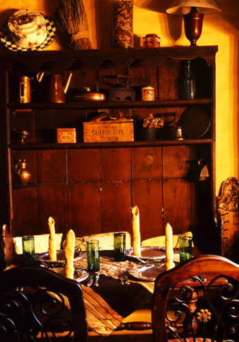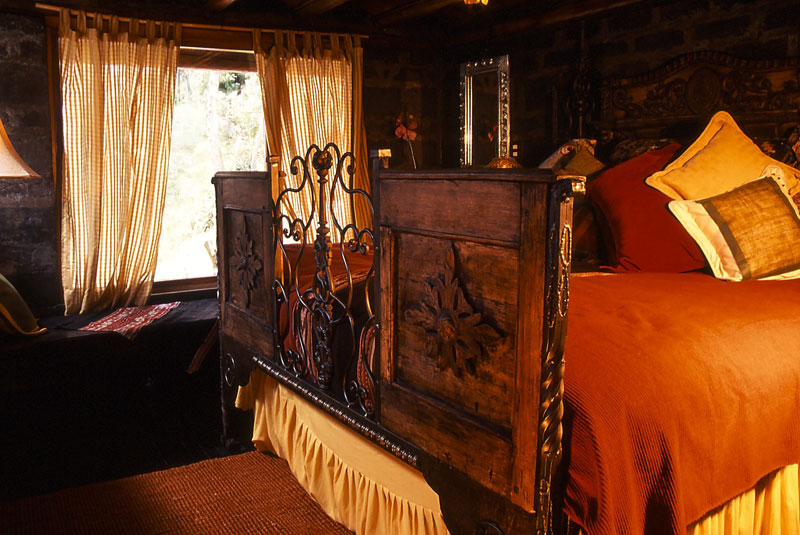The exceptionally appointed suites scattered around the hacienda are amongst the finest in the country. Each casita, or little house, boasts a minimum of 600 sq. feet. All are filled with a unique mix of antiques, art and collectables from the far corners of Ecuador. The guest rooms are the epitome of rustic luxury- pot bellied stoves, colonial art fluffy down covers, & spectacular bath rooms all housed within hand crafted walls of adobe and stone made and/or mined here on the property. All have cozy sitting rooms, spacious bedrooms and terraces or indoor gardens, and of course, the best views anywhere in Quito.
